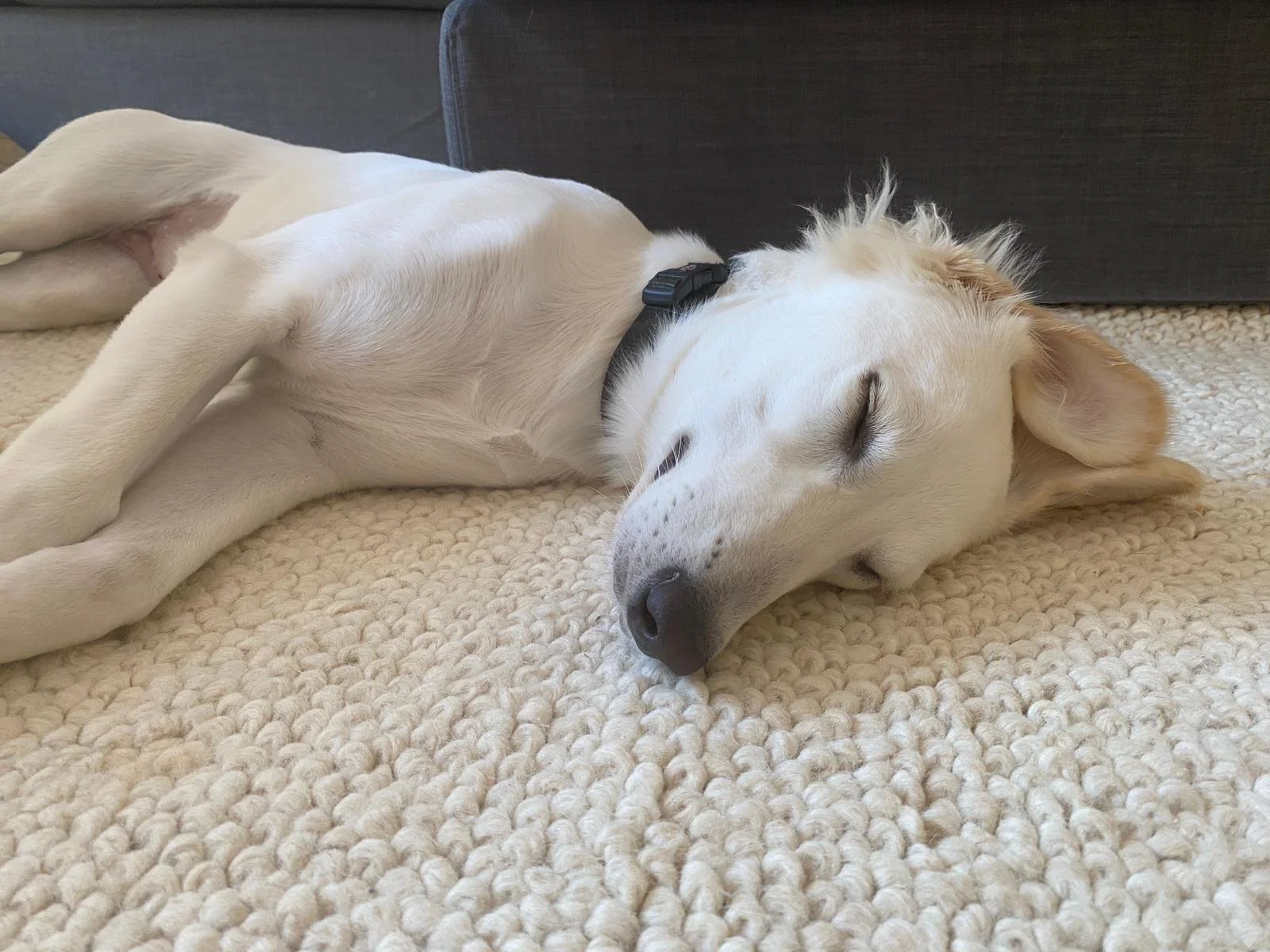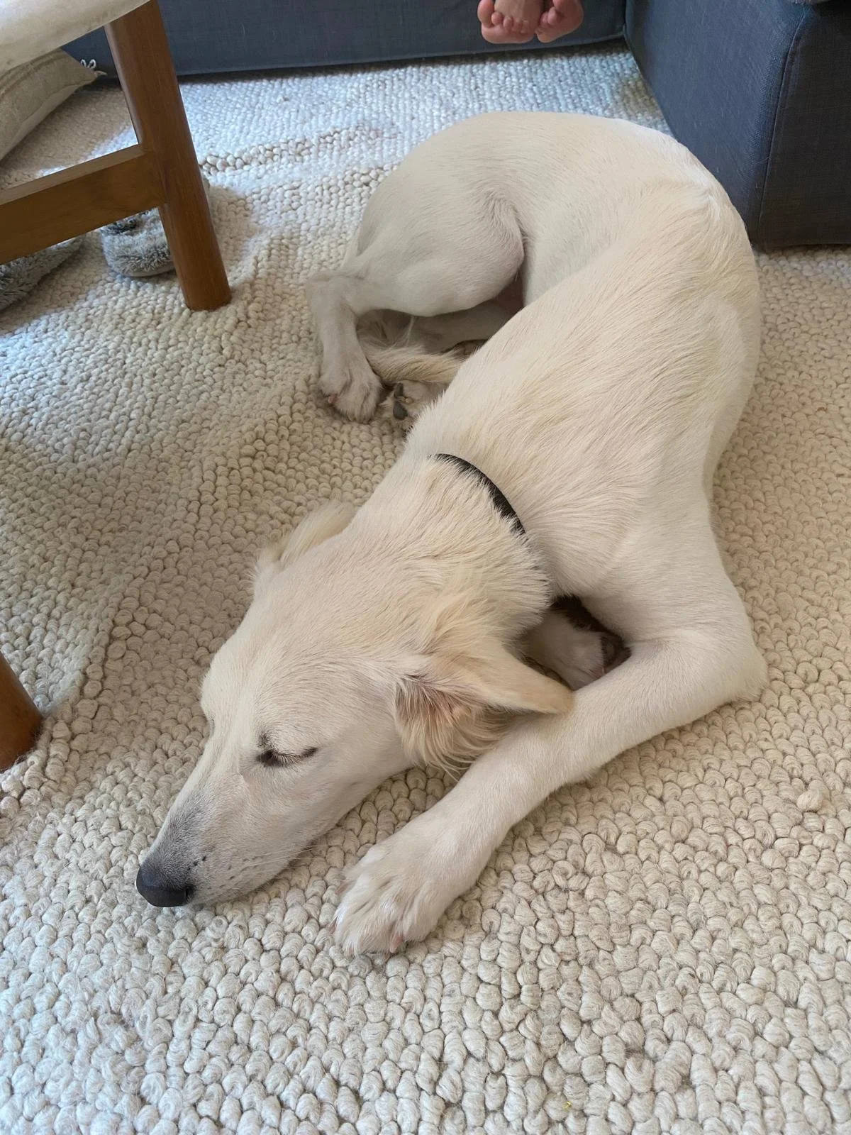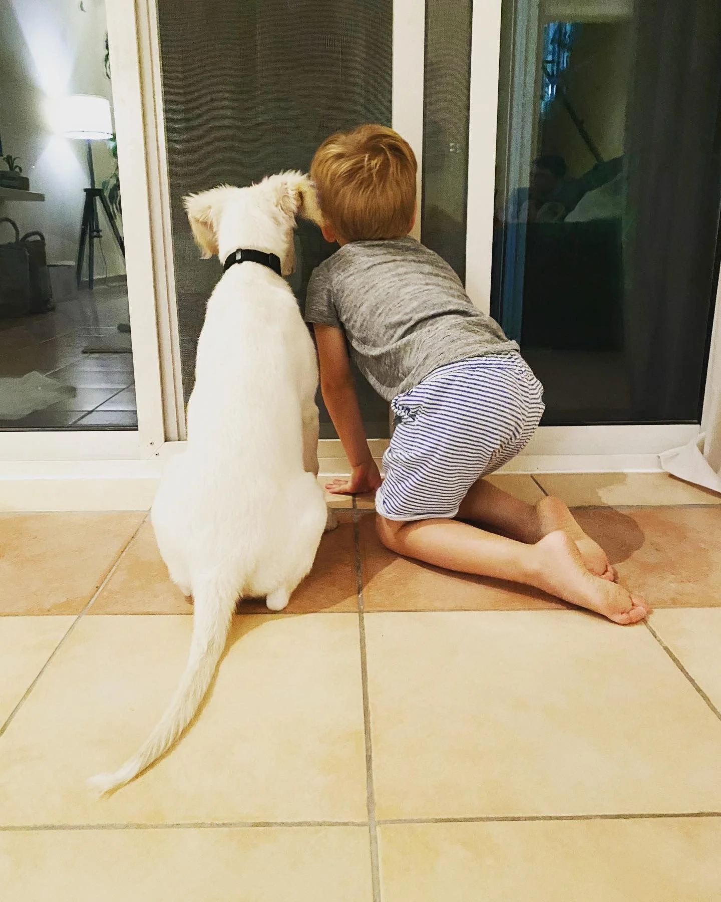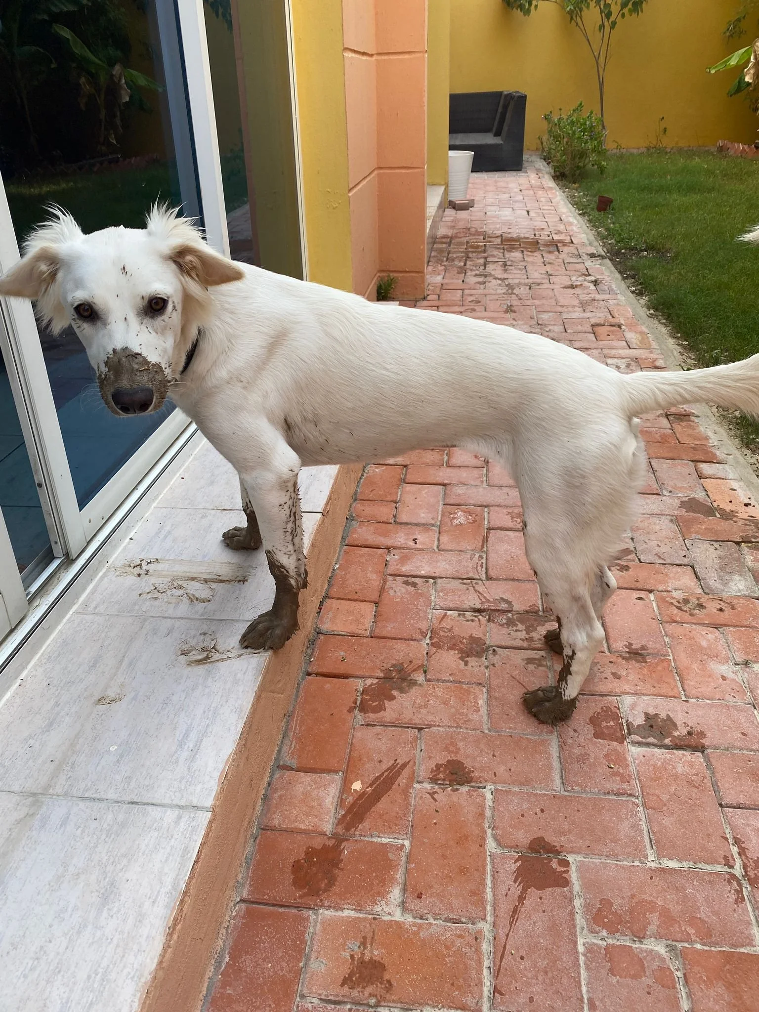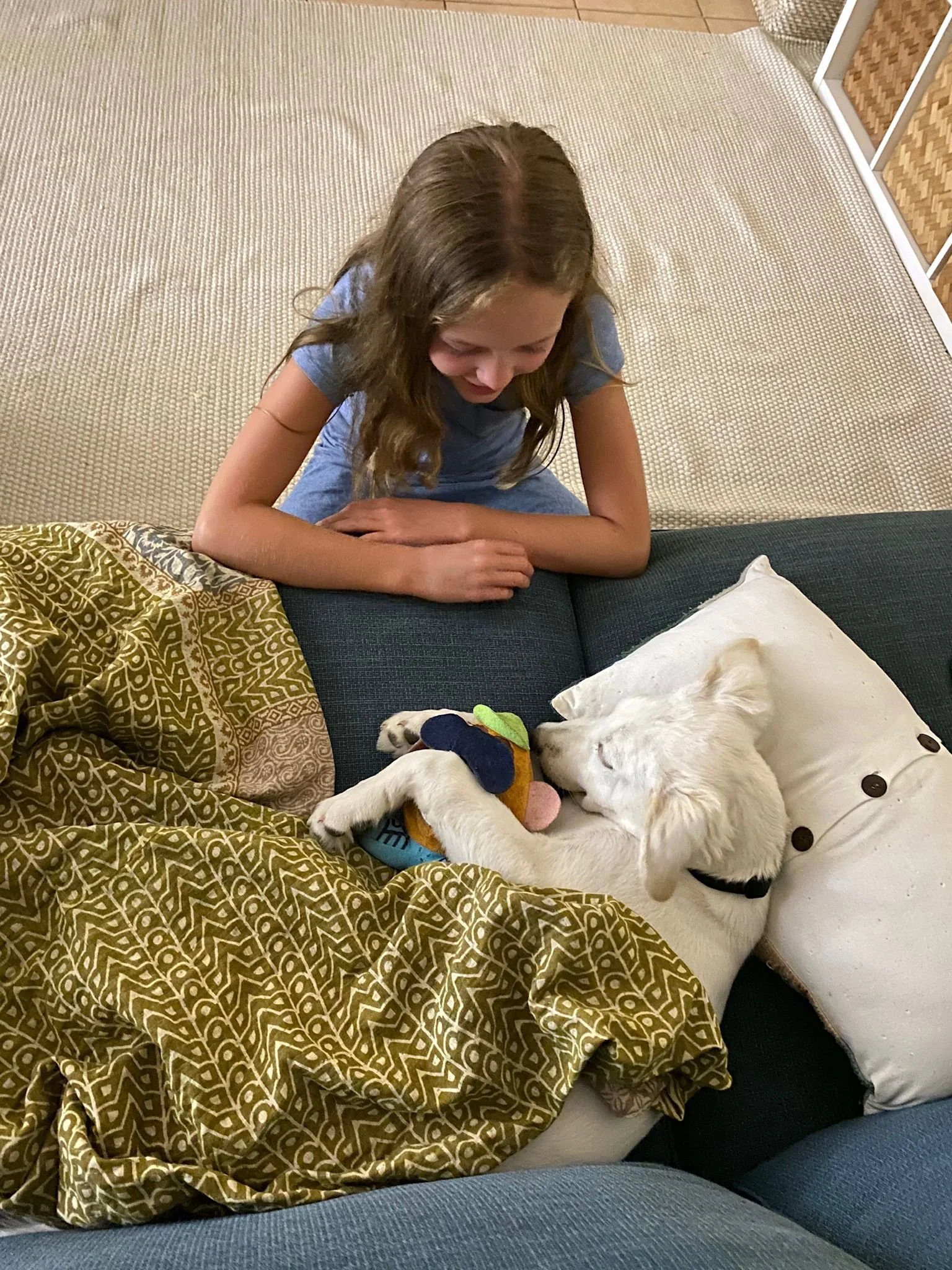 Floss loved her kiddos, loves other dogs and is great on leash. She has not been cat tested and will pull on leash when she sees one.